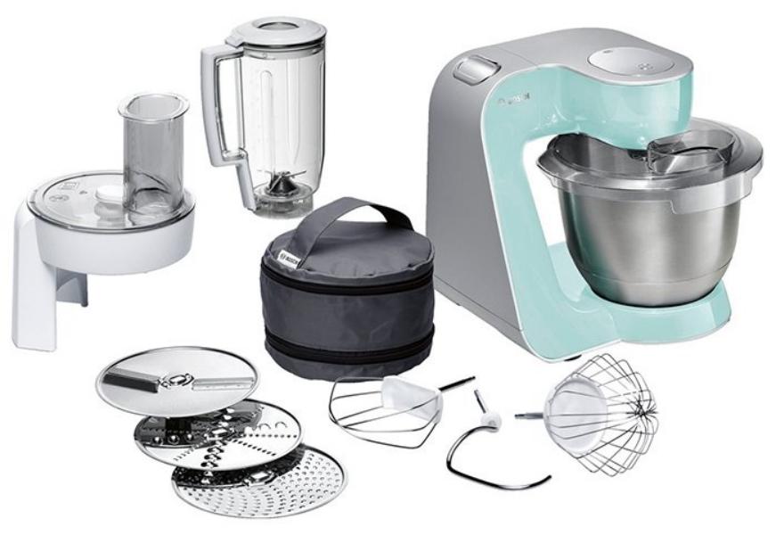 Насадки: насадка для теста, насадка для взбивания, терка, насадка для нарезки ломтиками, диск для нарезки соломкой, общее число насадок: 7