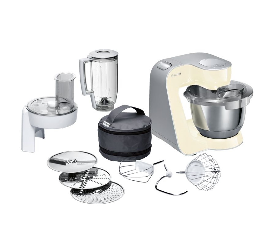 Особую многофункциональность обеспечивают высококачественные кондитерские насадки (венчик для взбивания, венчик для смешивания, насадка для замешивания теста) и долговечный измельчитель с тремя дисками для разных типов измельчения: измельчения, шинковки и нарезки и блендер.