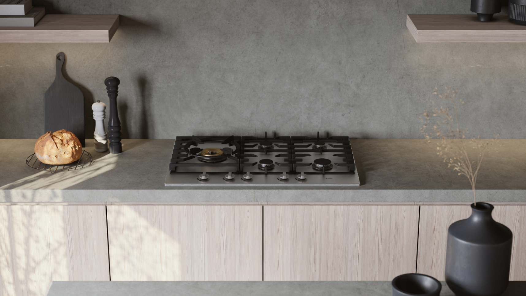 Газовая варочная панель с 5 конфорками разной мощности, включая конфорку Super Vario Wok. Механическое управление, автоматический электроподжиг и система газ-контроль.